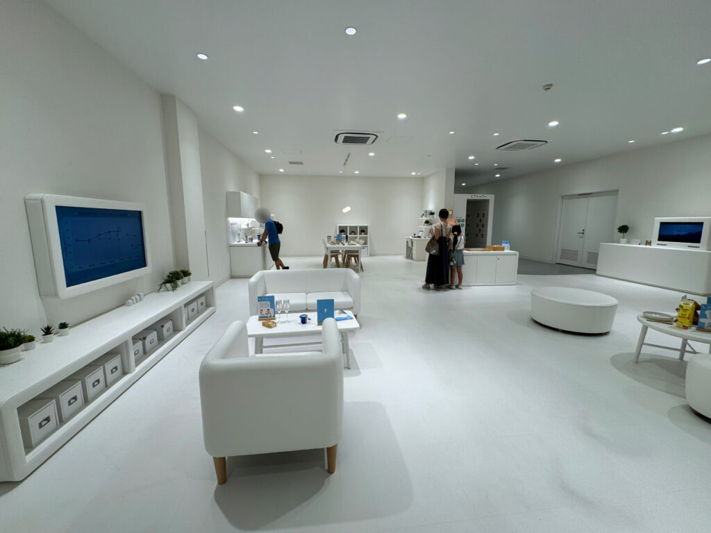 こちらも真っ白!おしゃれなお家のダイニングキッチン・リビングのようですね。いたるところに森永乳業製品が展示されています。