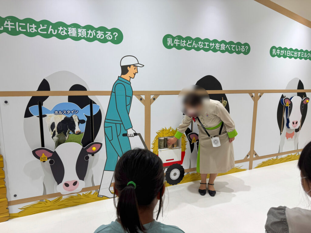 スタッフさんが乳牛について、展示を使いながらクイズ形式で楽しくお話してくれます。