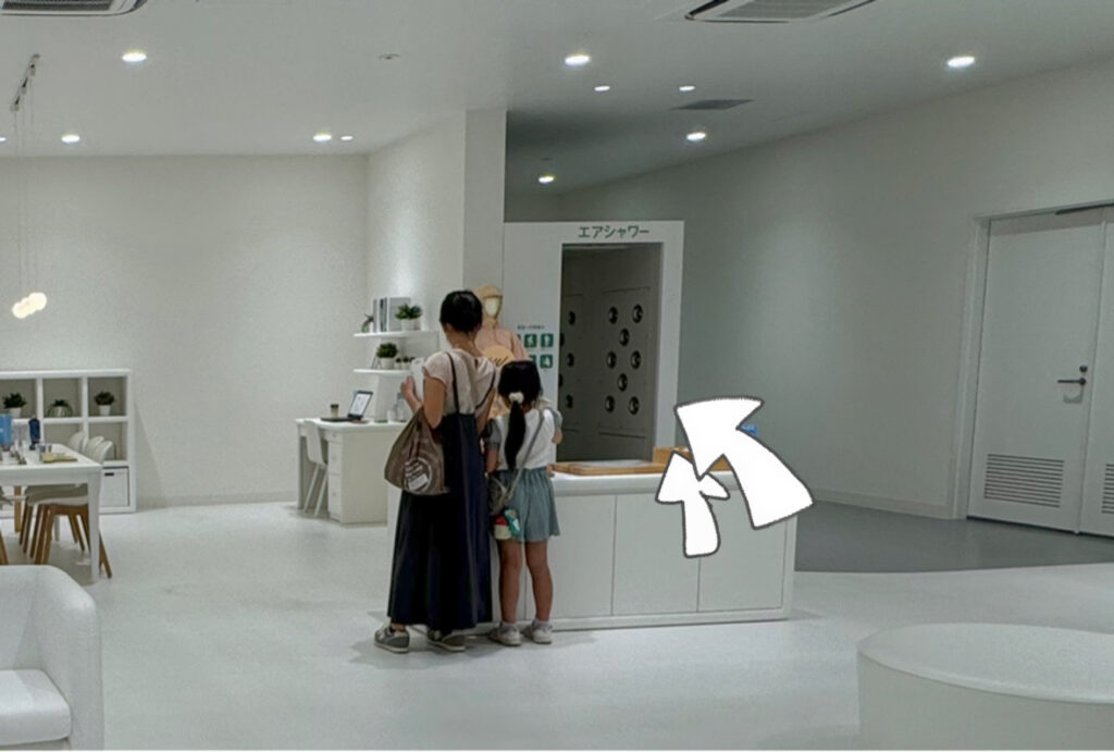 M’sルームの奥にエアシャワーがあるの、見えますか?ここを1人ずつ順番に通って次に向かいます。